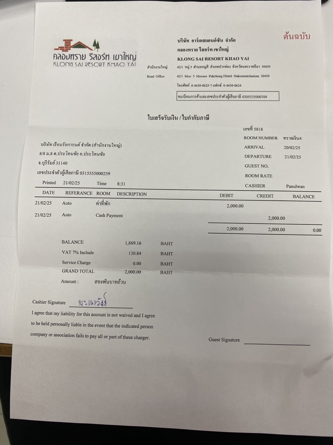 | 22 ก.พ. 2568 เวลา 00:00 No. 202502104 | (ไม่ได้ตั้ง) | อัครพล (พี่แบงค์office) | 1.ห้อง 3303 โรงแรม wifi ใช้งานไม่ได้