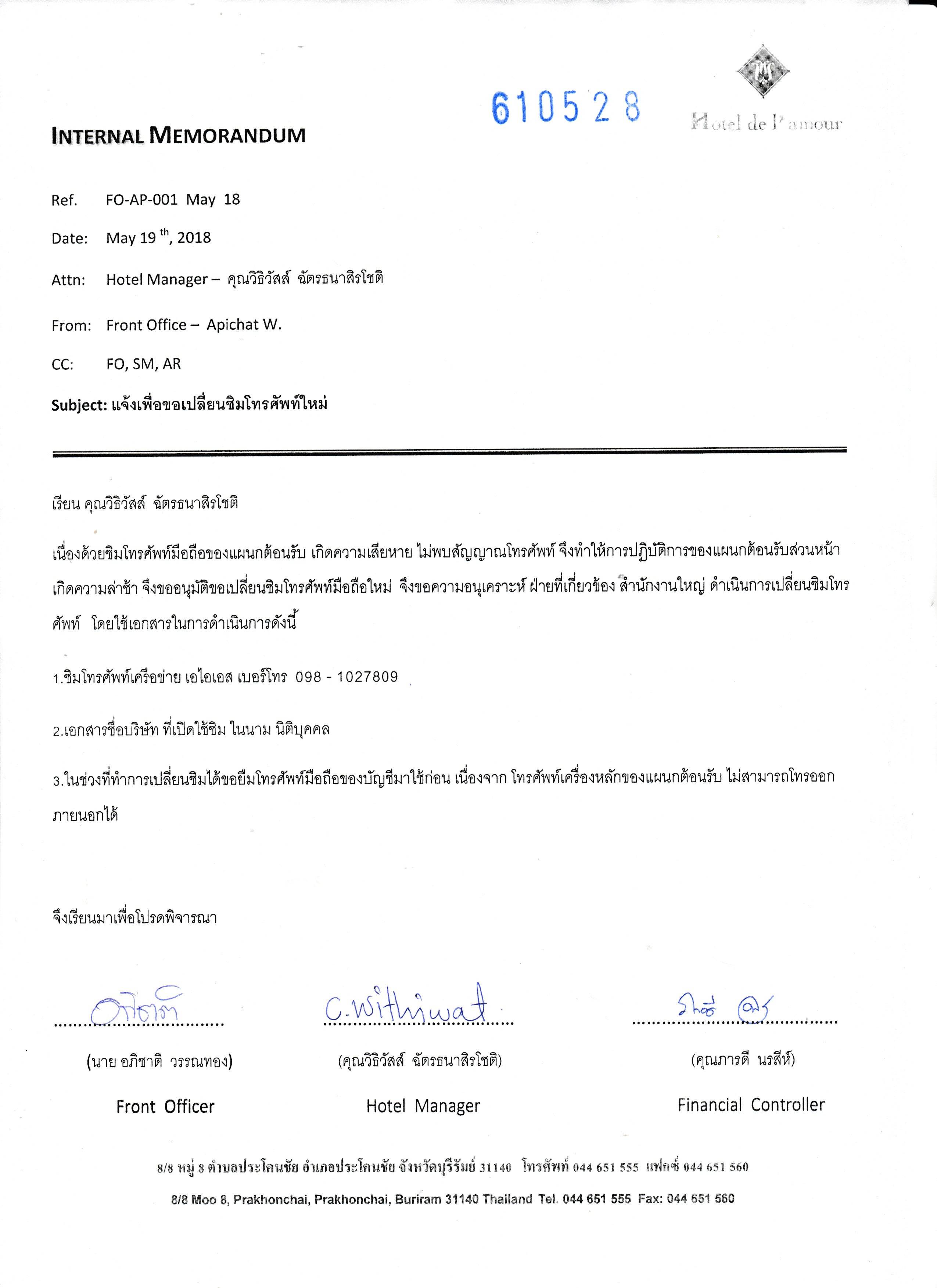 | 05 มิ.ย. 2561 เวลา 10:44 | (ไม่ได้ตั้ง) | PCH(พี่นา) | ดำเนินการทำเอกสารเปลี่ยนซิมการ์ดของ FO Hotel | สำเร็จ | |