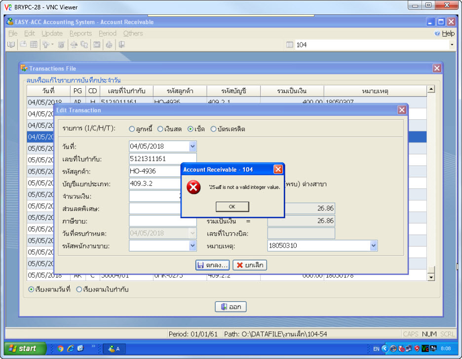 | 09 พ.ค 2561 เวลา 10:00 | Easy-Acc(ระบบบัญชี) | แพร(สัญญา) | ตัดลูกหนี้ไม่ได้ Easyacc