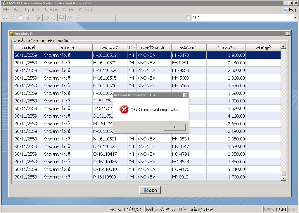 | 09 พ.ค 2561 เวลา 10:00 | Easy-Acc(ระบบบัญชี) | แพร(สัญญา) | ตัดลูกหนี้ไม่ได้ Easyacc