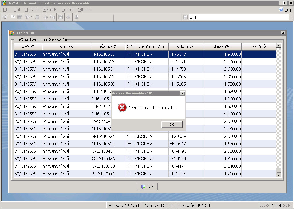| 09 เม.ย. 2561 เวลา 10:37 | Easy-Acc(ระบบบัญชี) | แพร(สัญญา) | มีไฟล์ขยะในข้อมูล ระบบ easy acc ลูกหนี้และรายได้ ไฟล์101 | สำเร็จ | |